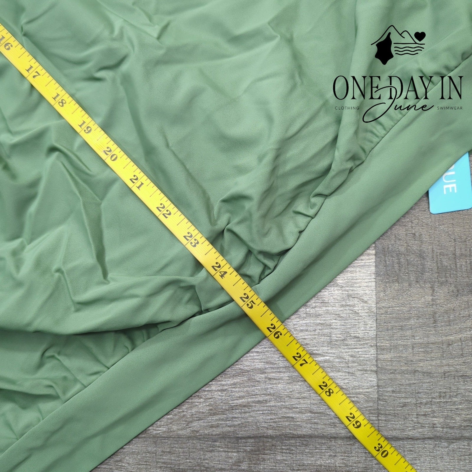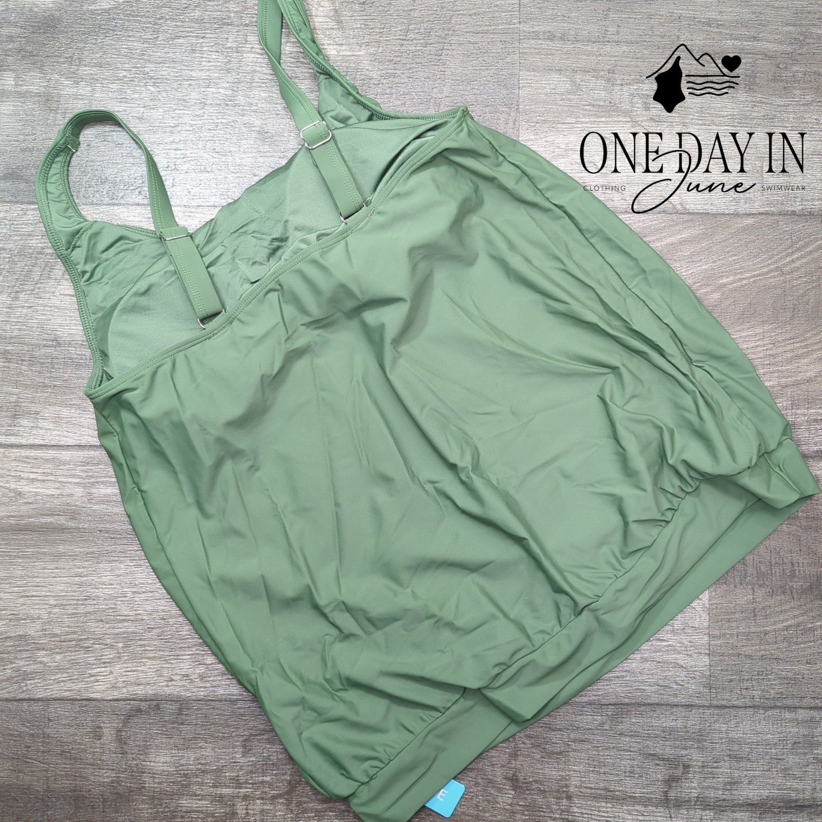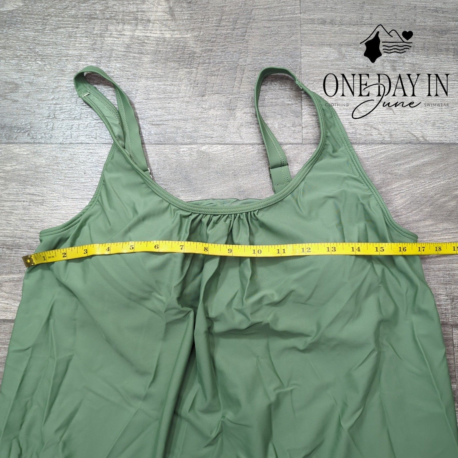 A most becoming blouson tankini in a verdant shade that would flatter any lady's complexion, whether she be taking the waters at Brighton or enjoying a summer's retreat by the lake. The graceful silhouette offers both elegance and comfort, being fashioned from a delightful blend of polyester and spandex that moves with the wearer's form. Brand new and awaiting its first adventure, this charming piece promises to elevate one's seaside wardrobe with proper sophistication.