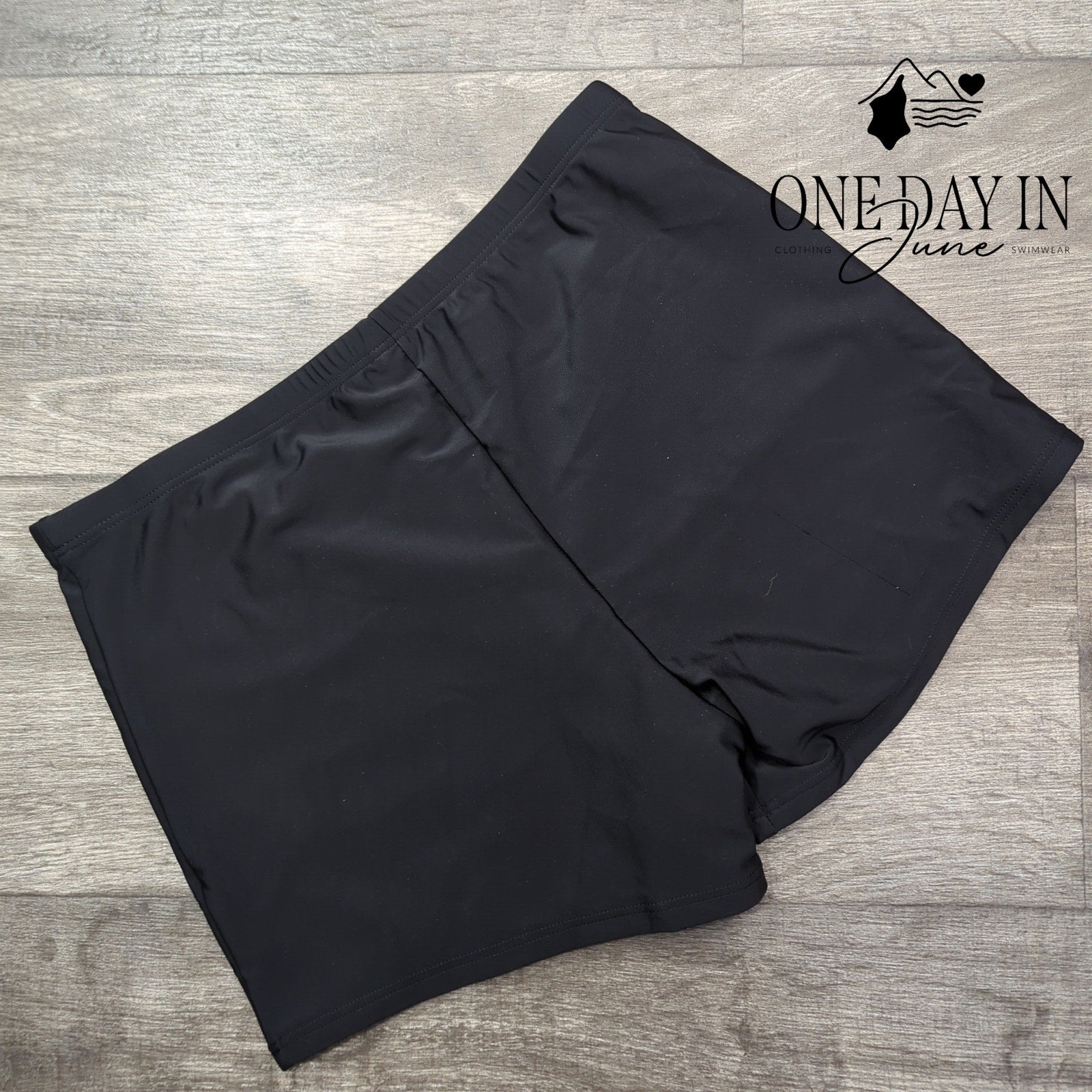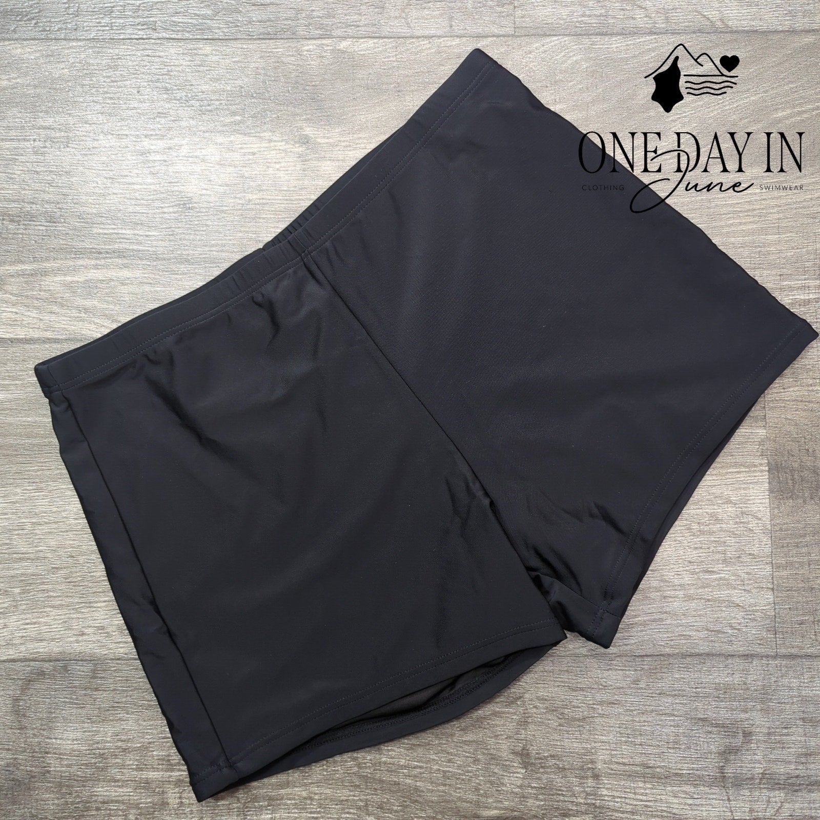 These elegant boyshort bikini bottoms embrace the modern woman with their sleek black silhouette and contemporary cut. Crafted from a luxurious blend of polyester and spandex, they promise both comfort and grace beneath summer's golden sun. A testament to refined beachwear, they await their debut on sun-dappled shores where sophistication meets the sea.