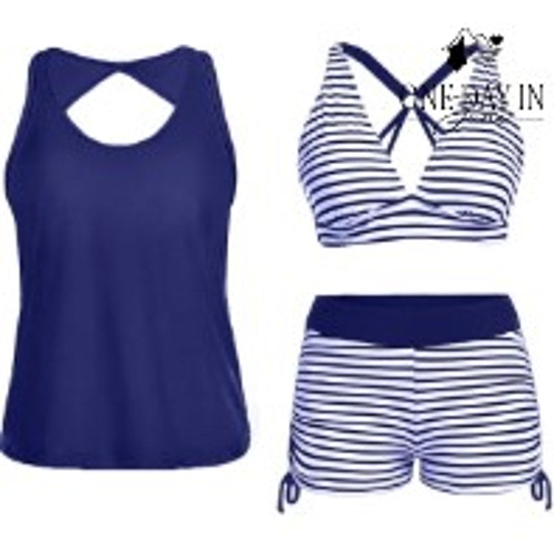 A most charming three-piece ensemble in a delightful shade of blue, featuring boyshort bottoms and a crop-style top that shall provide both comfort and coverage for the discerning lady's aquatic pursuits. The clever design offers a modern sensibility whilst maintaining proper deportment for seaside activities. Crafted from a blend of nylon and spandex, this fetching swimsuit promises both durability and a most agreeable fit for all manner of summer diversions.