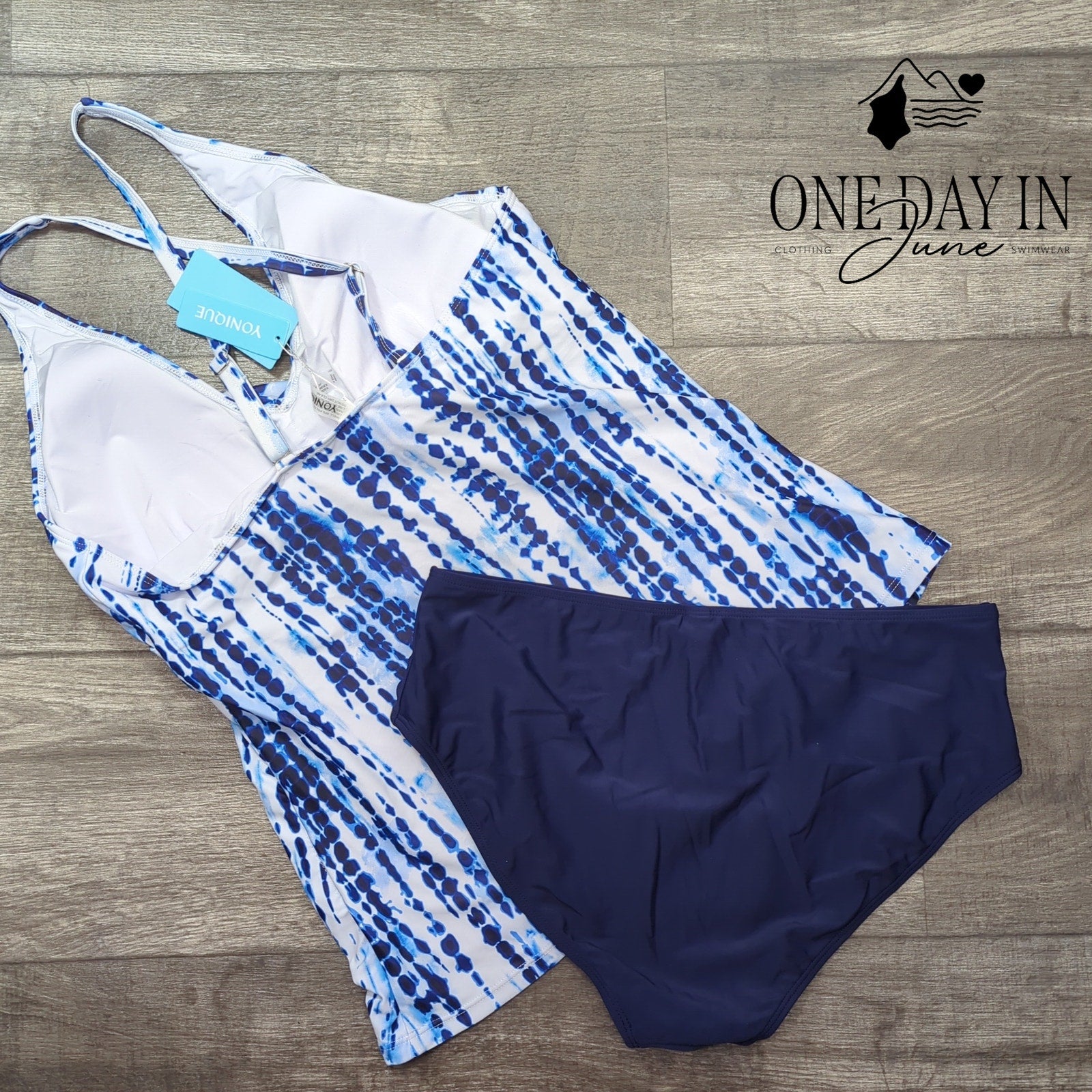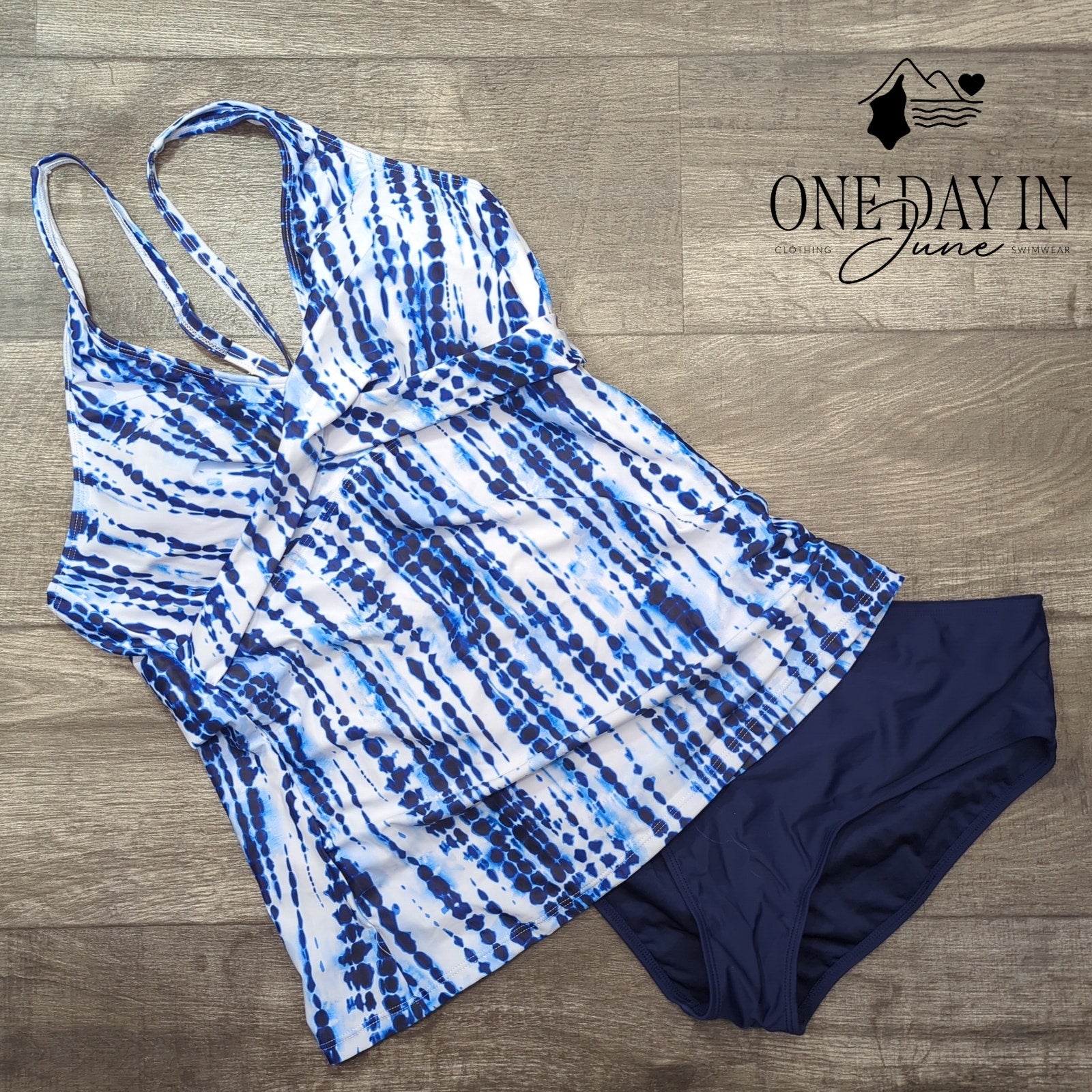 A beguiling azure and ivory tankini that captures the essence of summer's most enchanted afternoons. This cross-back design whispers of poolside sophistication, where comfort meets the timeless allure of seaside elegance. Like a gentle wave caressing the shore, the flowing silhouette promises to embrace you with grace and confidence.