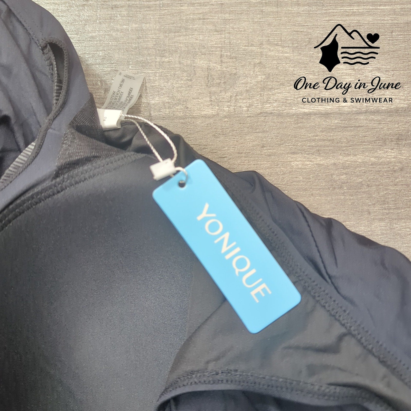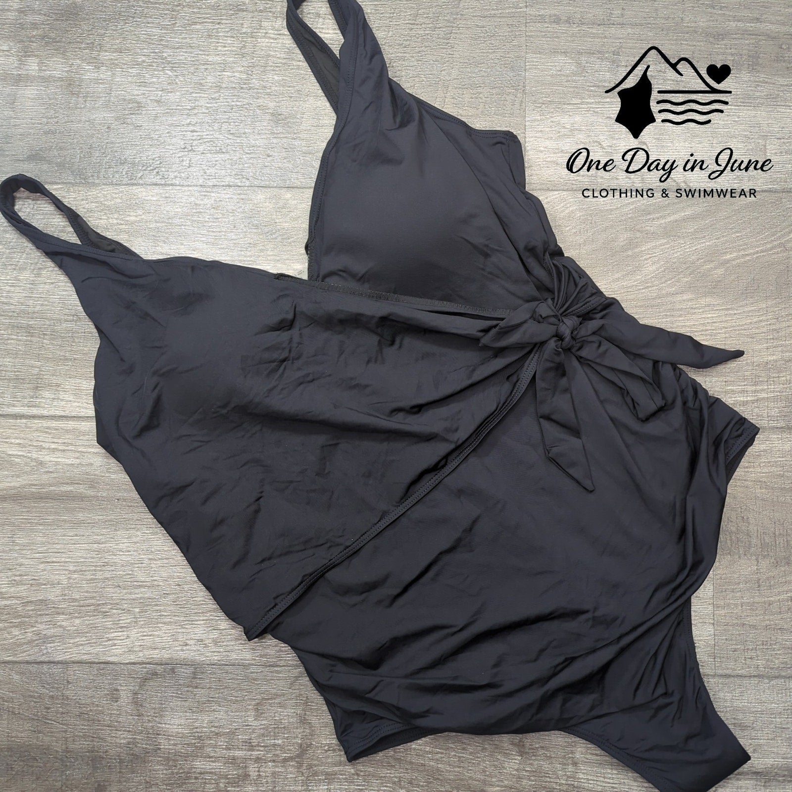 This sleek black swimsuit by Yonique whispers of midnight dips and moonlit shores, its graceful tie-side detail adding a touch of Jazz Age allure. Crafted from supple polyester and spandex blend, it embraces every curve with the tender confidence of a lover's promise, transforming poolside moments into occasions of quiet elegance.
