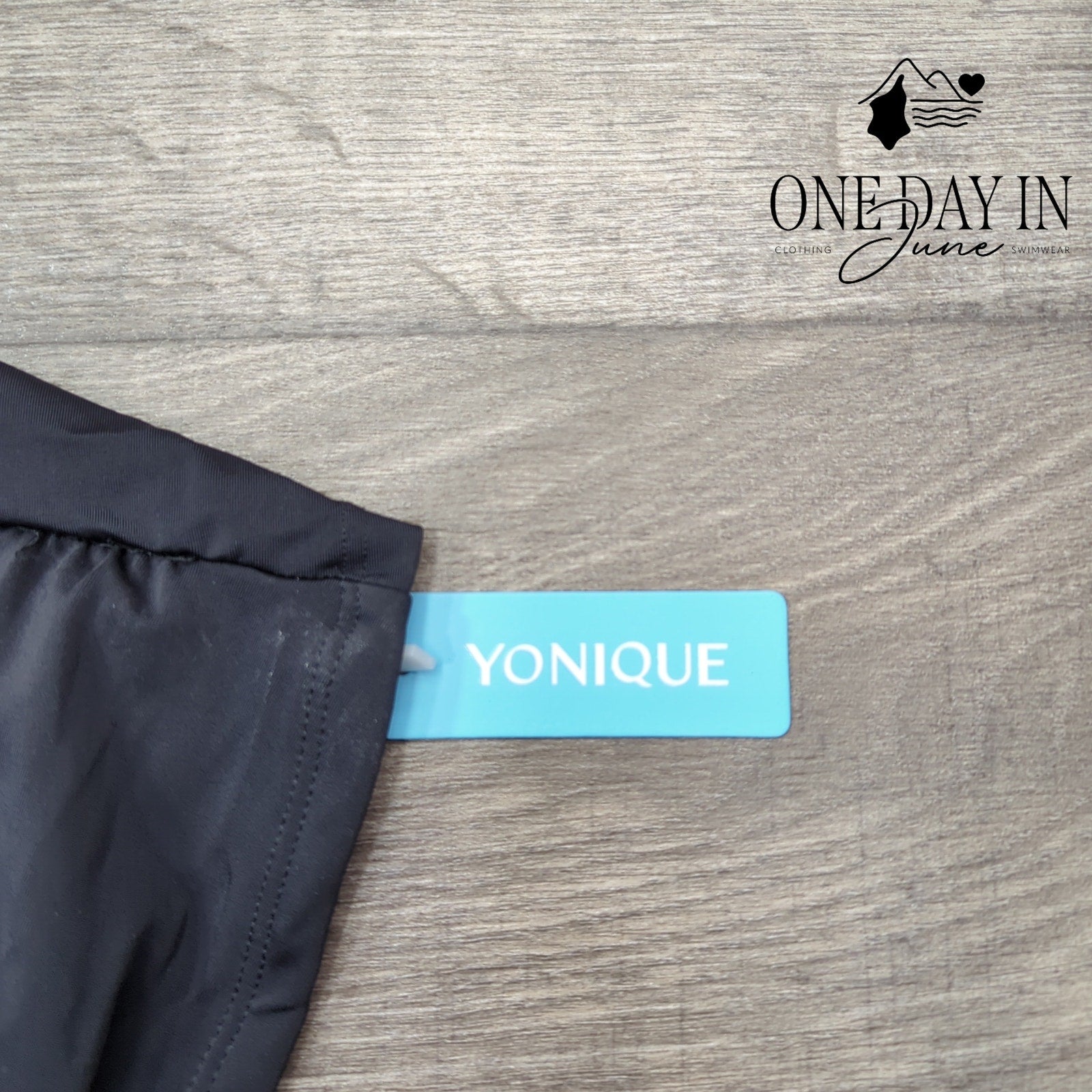 A most charming ruffle one shoulder tankini from Yonique, executed in the most elegant black that would flatter any lady of discerning taste. The asymmetrical design speaks to a modern sensibility while maintaining perfect propriety for seaside pursuits. This delightful piece arrives in pristine condition with tags attached, ready to accompany you on your aquatic adventures with both style and confidence.