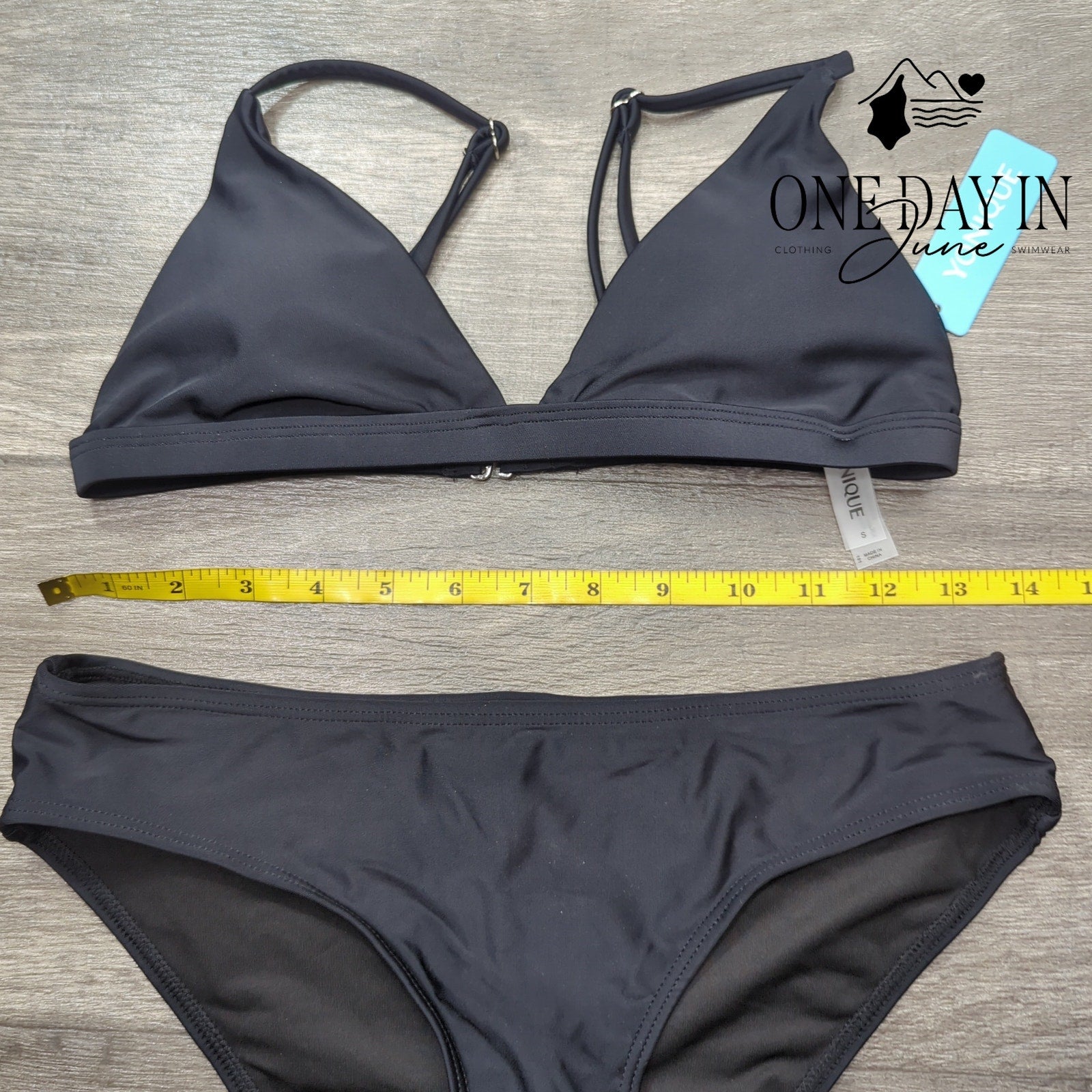 This sleek black triangle bikini cuts through the chaos of summer with razor-sharp precision, a polyester and spandex masterpiece that clings to curves like destiny to a desperate gambler. The modest cut screams sophistication while the fabric moves like liquid rebellion against conventional beachwear tyranny. Brand new with tags still attached, this Yonique creation promises to transform any poolside scene into a theater of aquatic excellence.