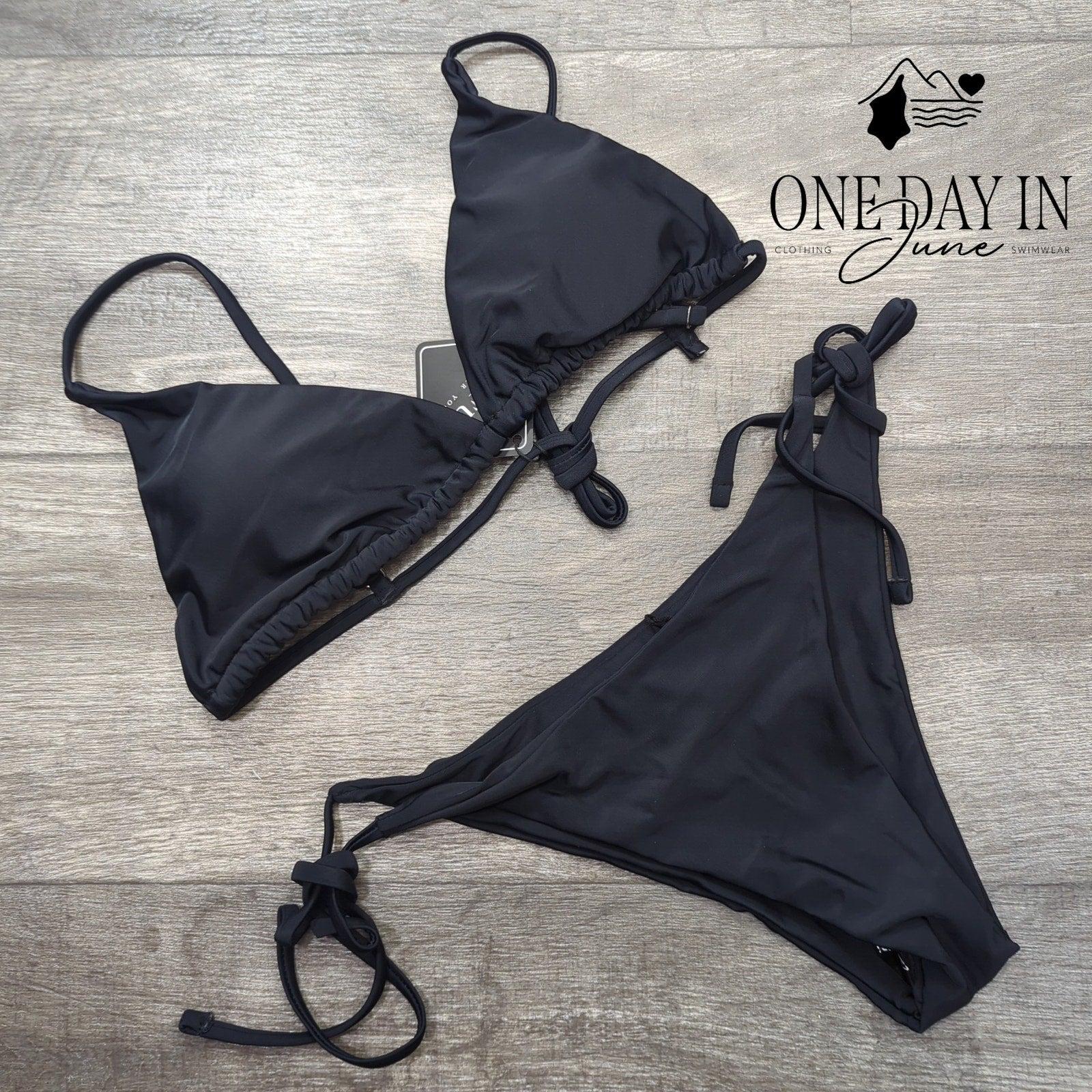 The summer madness descends upon us like a fever dream, and this sleek black triangle bikini emerges from the chaos as your ticket to aquatic salvation. Adjustable straps dance with tie-side bottoms in a symphony of comfort and style, crafted from a polyester-spandex blend that moves like liquid rebellion against conformity. Brand new and waiting to transform any poolside gathering into your personal stage of sun-soaked glory.