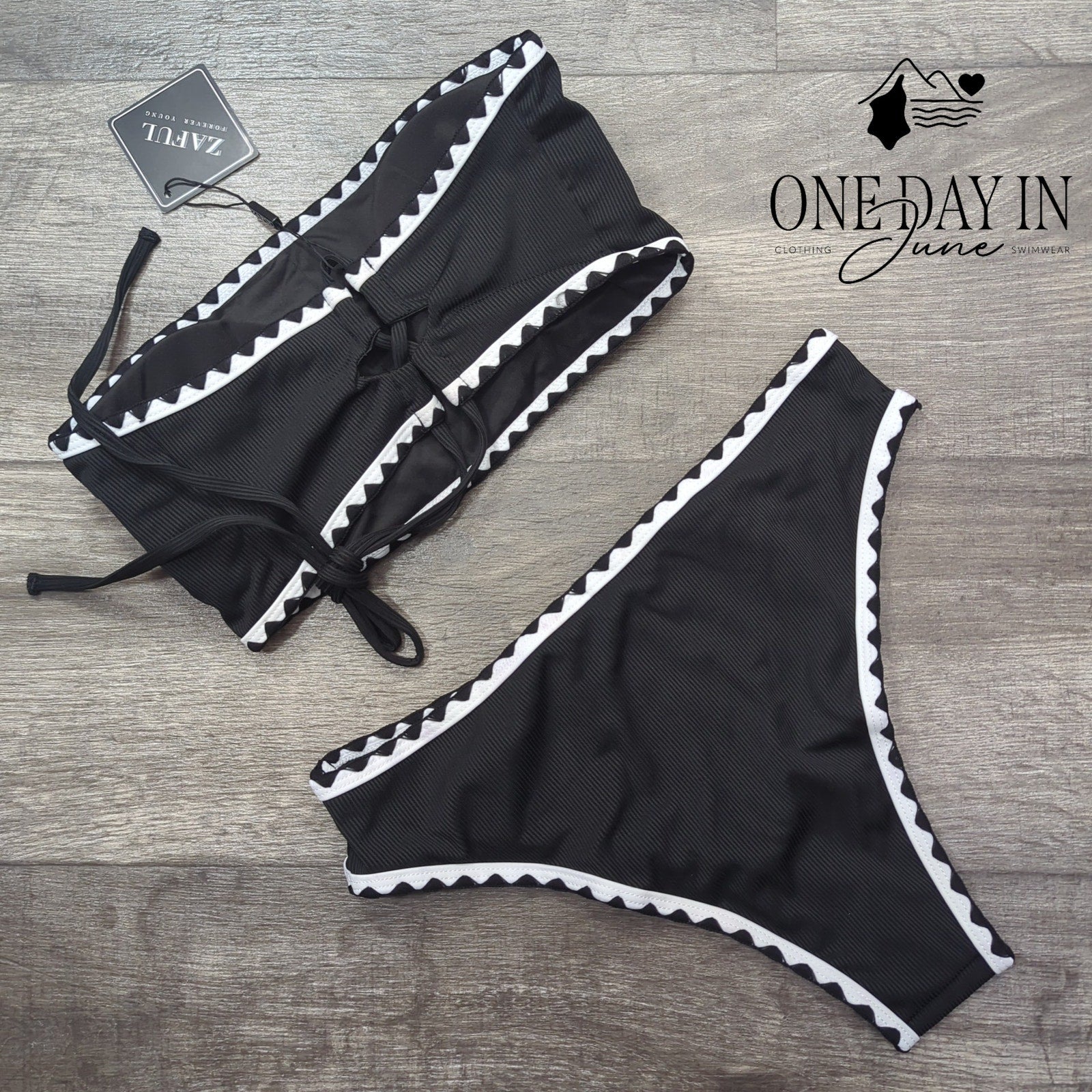 This black bandeau beauty with ribbed delight will make your beach days oh-so-bright! A stretchy, comfy swimsuit treat that's perfect for fun in the summer heat!