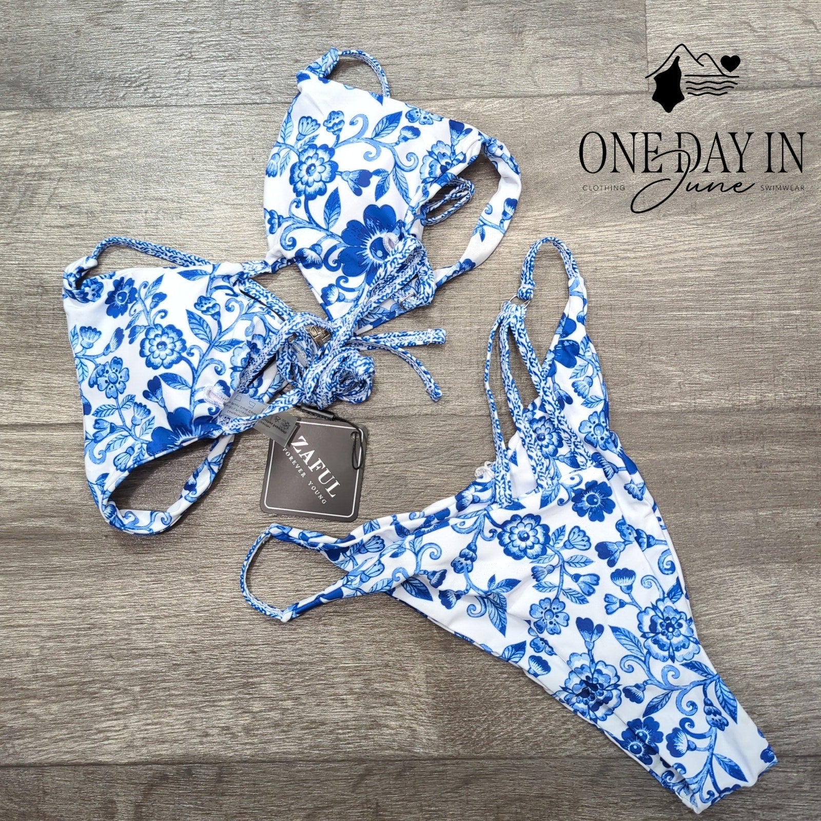 The summer madness has descended upon us and this wild blue and white floral bikini is your ticket to aquatic liberation, a polyester and spandex symphony that'll make you the most dangerous creature by any poolside from here to the Pacific. This cheeky little number from Zaful arrives fresh with tags still attached, ready to transform any ordinary swimmer into a water-bound warrior princess. The flowers bloom across this two-piece masterpiece like some kind of beautiful chaos, designed to make waves in all the right places while the ocean calls your name.