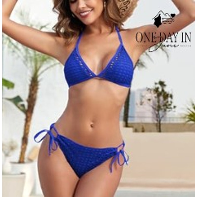 A most charming blue bikini of considerable elegance, featuring flattering halter ties and delightfully adjustable side fastenings that shall accommodate any lady's figure with the utmost propriety. This fetching two-piece is crafted from a pleasing blend of polyester and spandex, ensuring both comfort and a most becoming silhouette for seaside diversions. Fresh from its packaging and never worn, it awaits only the discerning lady who appreciates both style and quality in her aquatic attire.
