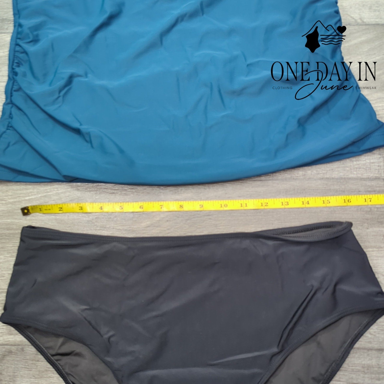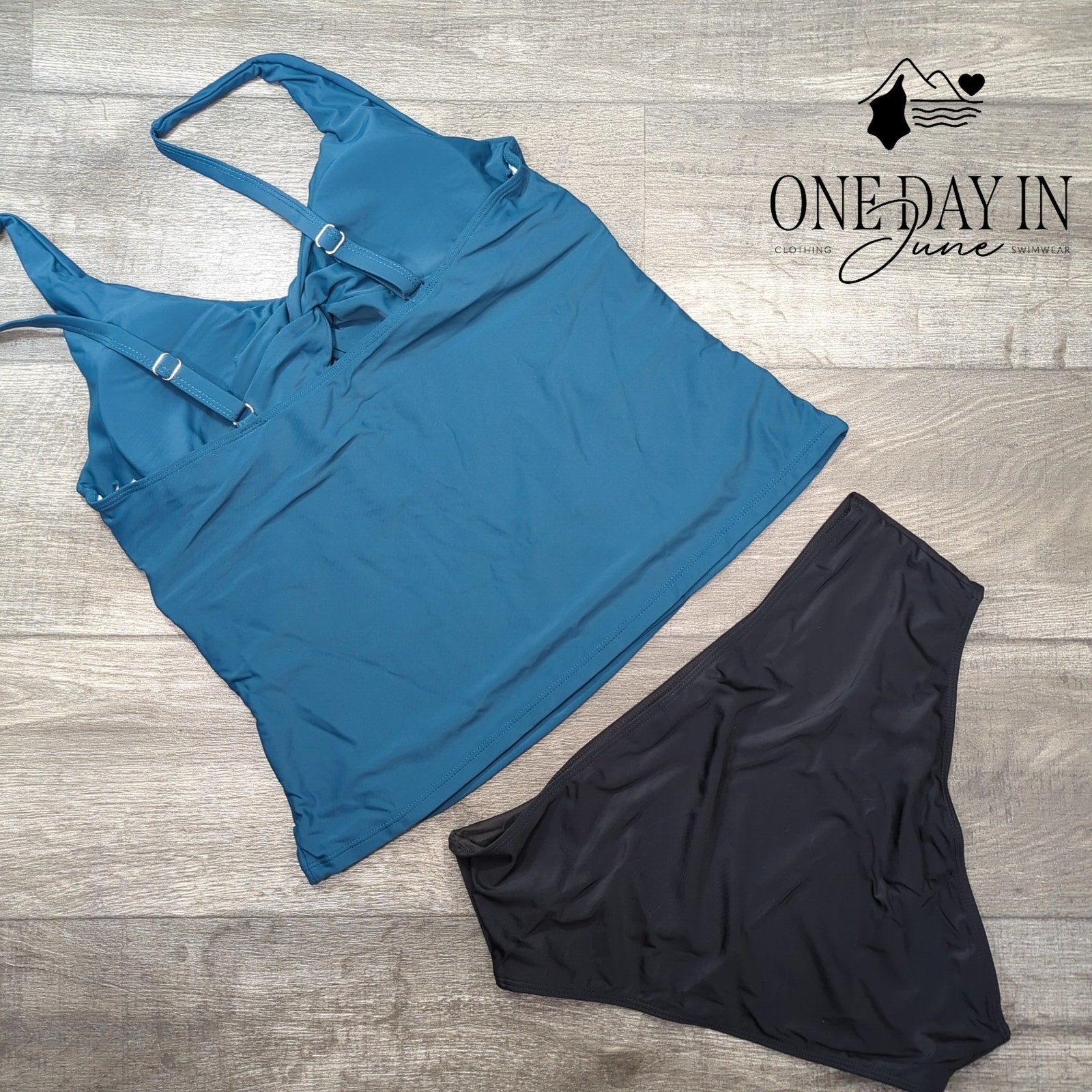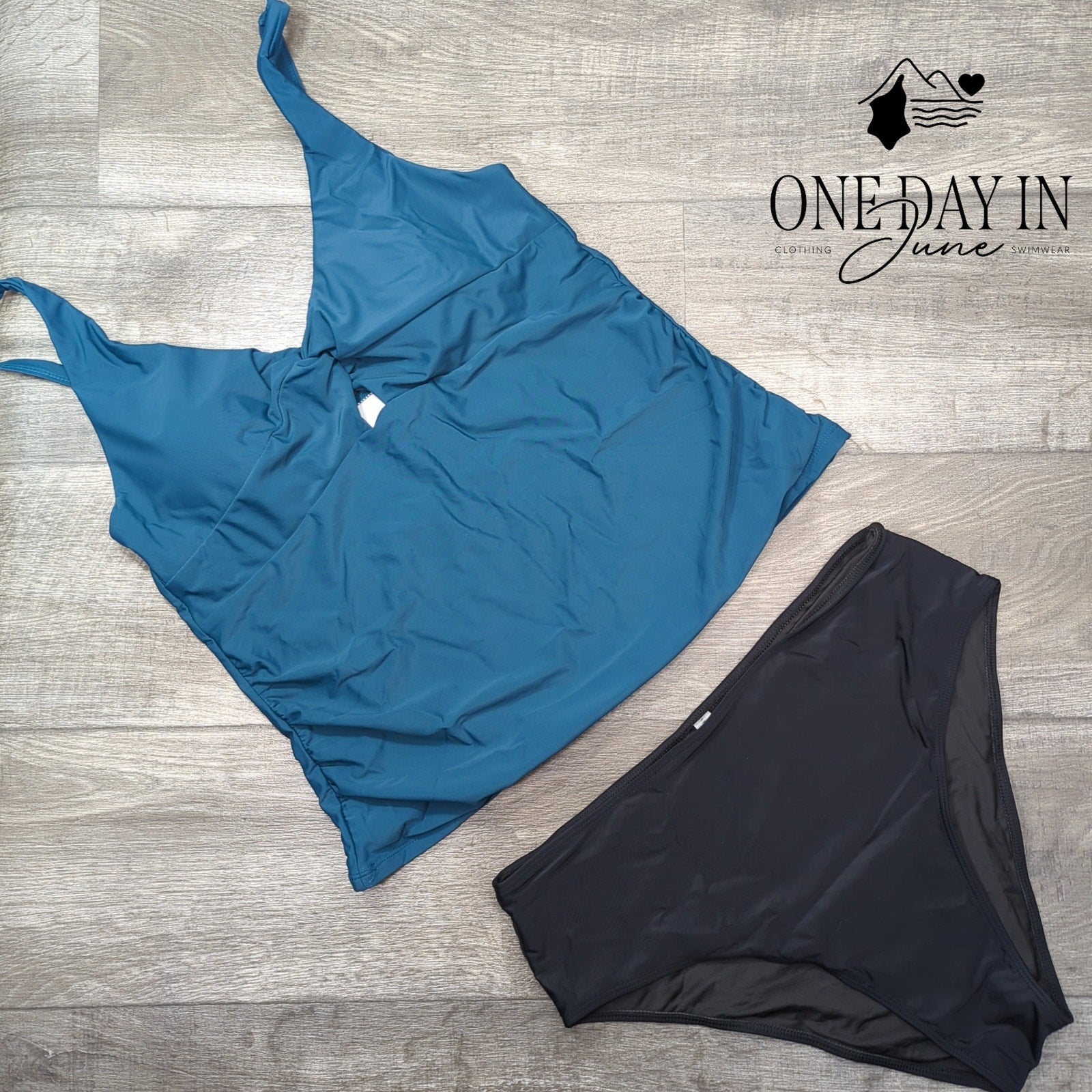 This exquisite tankini captures the essence of summer romance with its dreamy blue-green hue that mirrors the depths of a Mediterranean cove. The cross-front keyhole design whispers of sophisticated allure, while the flowing silhouette flatters with the grace of a seaside goddess. Crafted from a luxurious polyester-spandex blend, this piece promises both comfort and elegance for your aquatic adventures.
