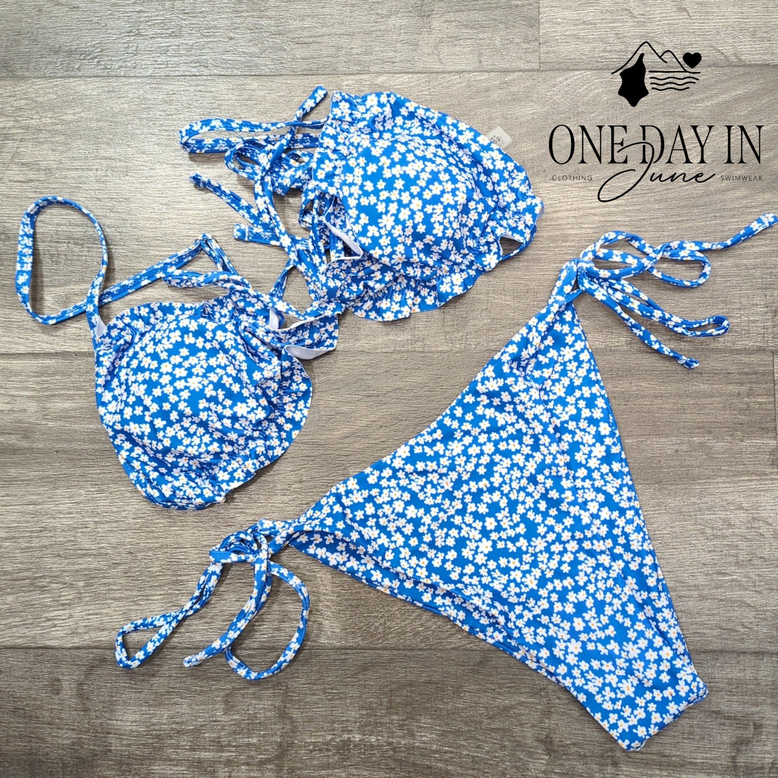 Oh my stars, what a sight to behold - a blue floral bikini with ruffles so bold! With tie-sides that flutter and flowers that bloom, this swimsuit will brighten up any beach room!
