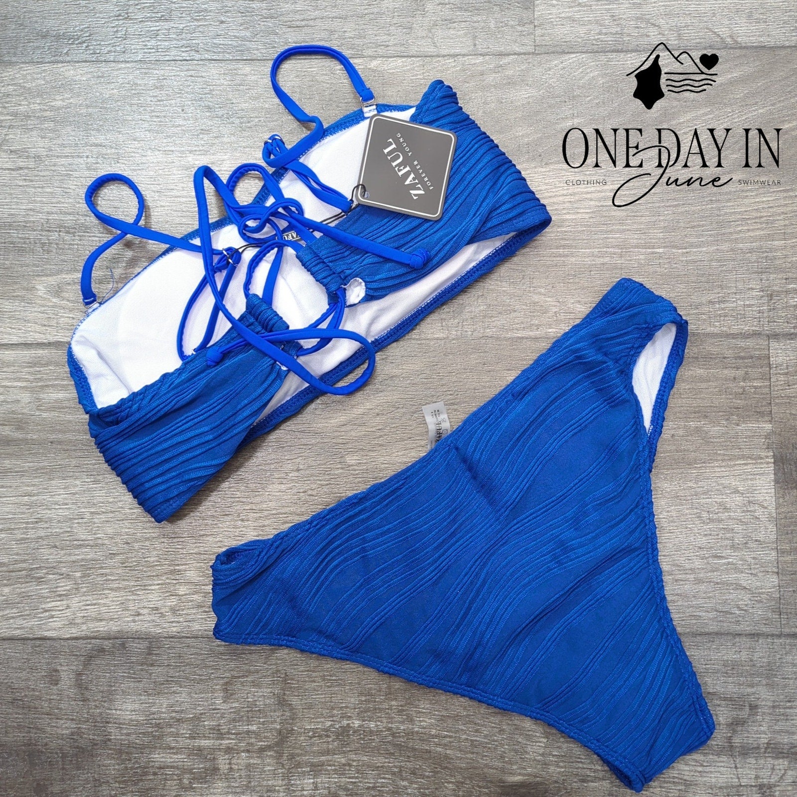 This textured bandeau beauty in brilliant blue will make waves wherever you choose to cruise! With stretchy soft fabric that hugs just right, you'll splash and dash from morning until night!