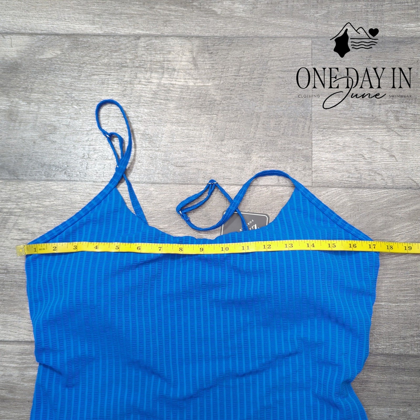 This electric blue beast of a swimsuit crashes onto the scene with textured waves that ripple across the fabric like liquid thunder, while that daring open-back design whispers dangerous secrets to anyone bold enough to slip into its synthetic embrace. The polyester-spandex blend clings with the desperate intensity of a lover's promise, transforming the ordinary beach experience into something altogether more magnificent. Brand new with tags still attached, this aquatic armor piece awaits its destined warrior to conquer poolside territories and beachfront kingdoms with reckless abandon.