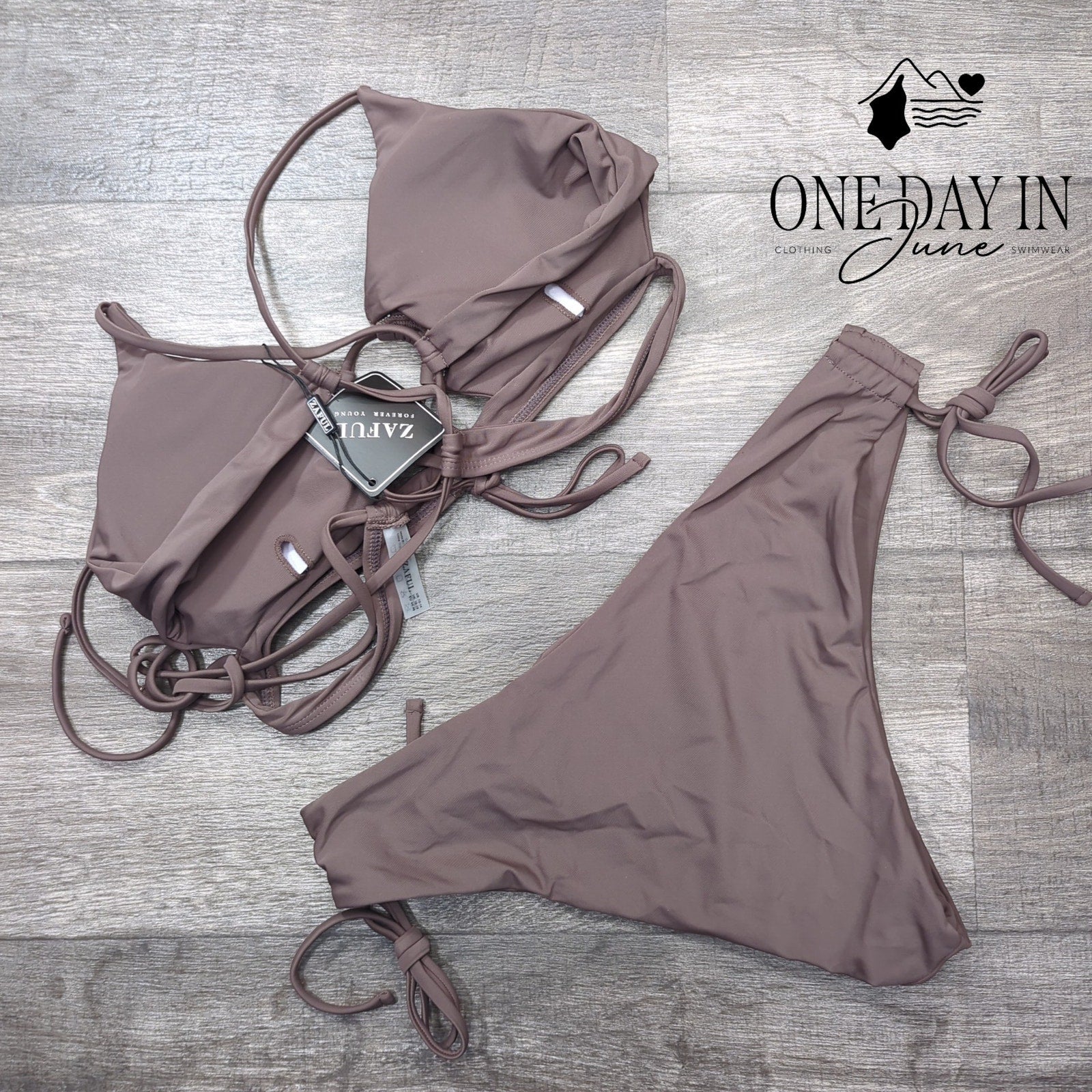 This enchanting brown bikini captures the essence of summer romance with its playful tie-back top and flirtatious side-tie bottoms. Crafted from a luxurious blend of polyester and spandex, it promises both comfort and allure for the modern woman. A perfect companion for poolside soirées and sun-drenched afternoons where memories are made.