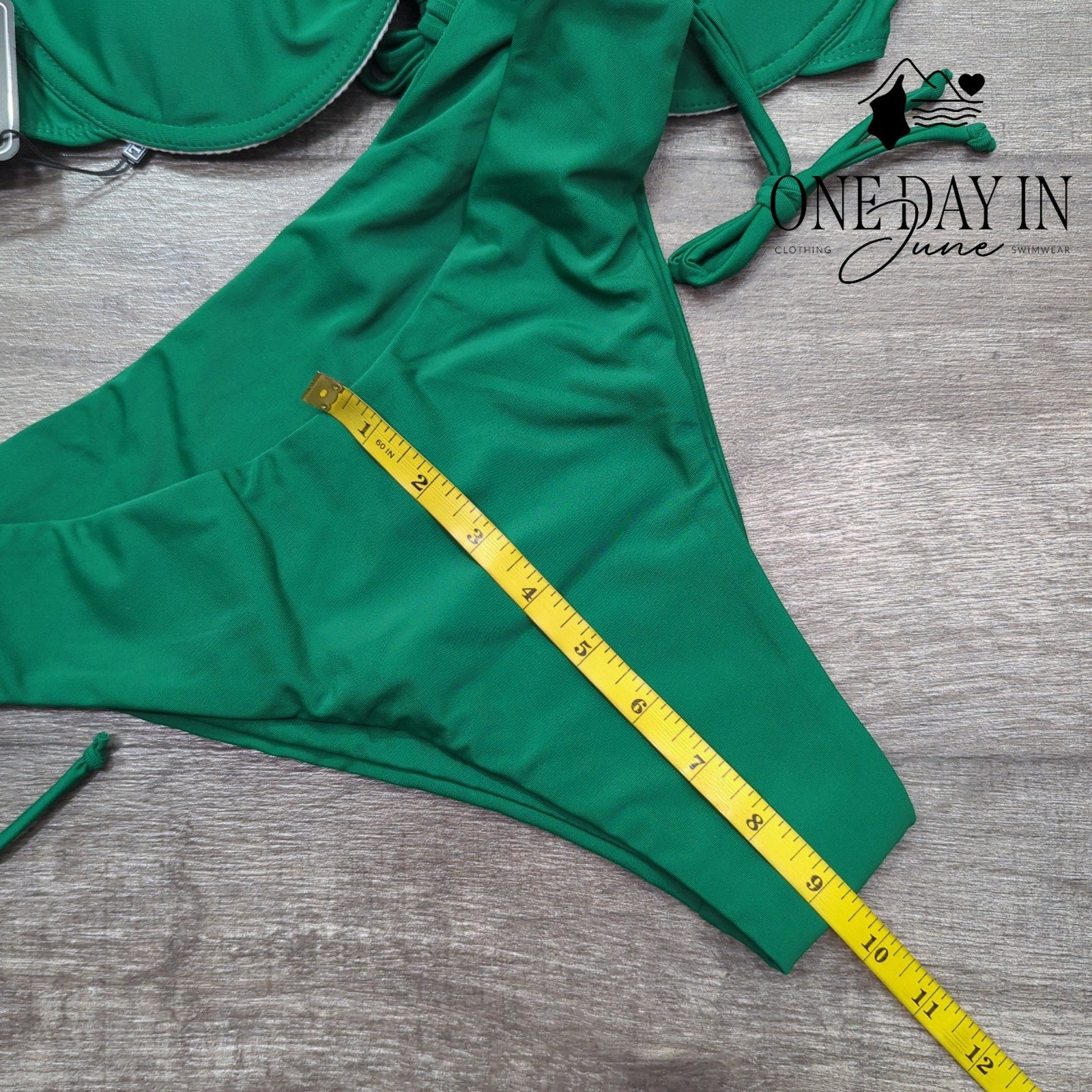 This enchanting emerald bikini captures the essence of summer glamour with its flattering underwire support and charming tie-back detail. Crafted from a luxurious polyester-spandex blend, the suit moves like liquid silk against sun-kissed skin. Fresh from its tags, this piece promises to transform any poolside moment into an affair of effortless elegance.