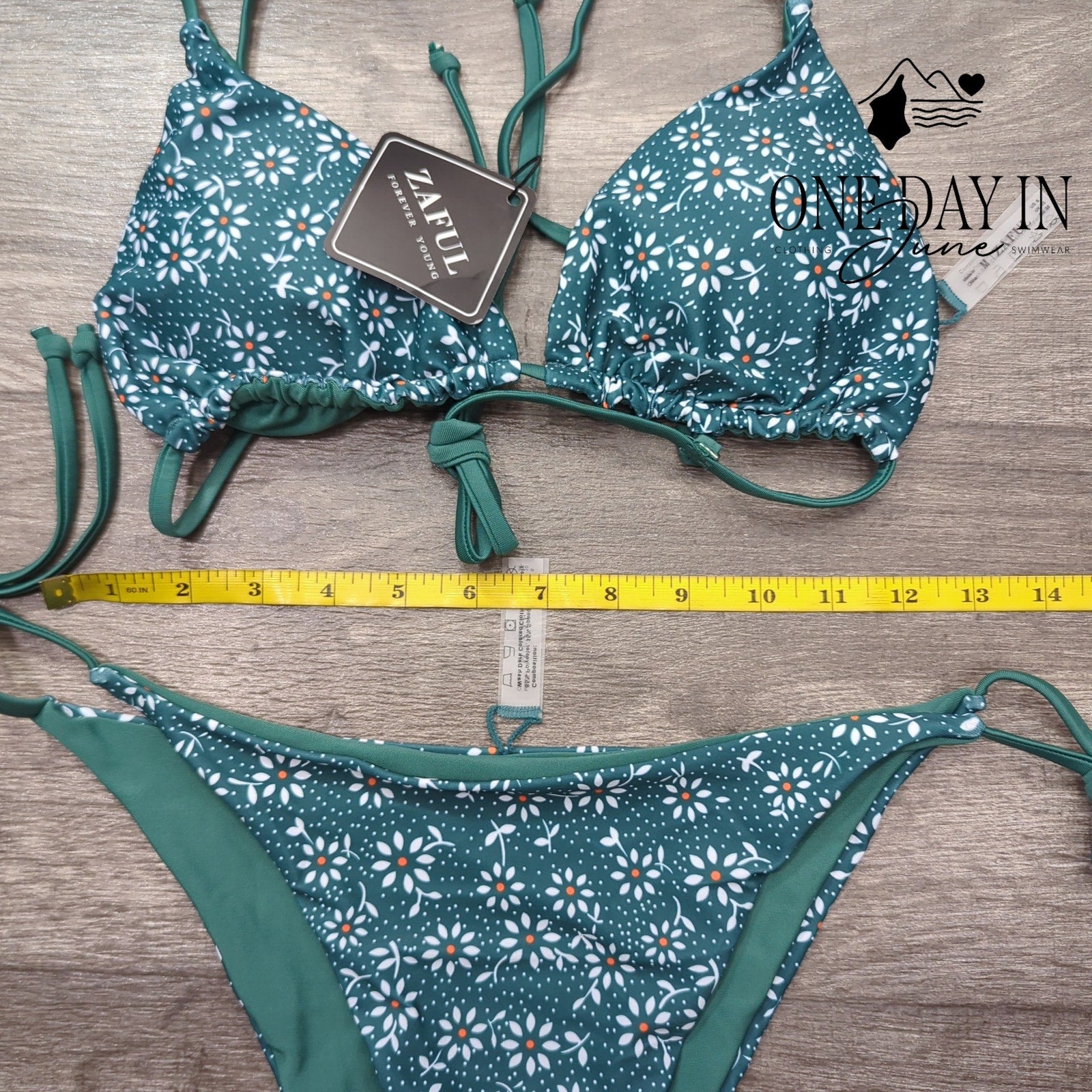 This emerald-green triangle bikini emerges from the depths of summer madness like a fever dream of poolside perfection, with tie-side bottoms that dance in the wind like tiny flags of rebellion against the tyranny of tan lines. The polyester-spandex blend stretches and moves with your body like liquid confidence, transforming any beach or backyard into your personal oasis of sun-drenched freedom. Brand new with tags still attached, this Zaful creation waits patiently to unleash its chlorinated chaos upon the world.