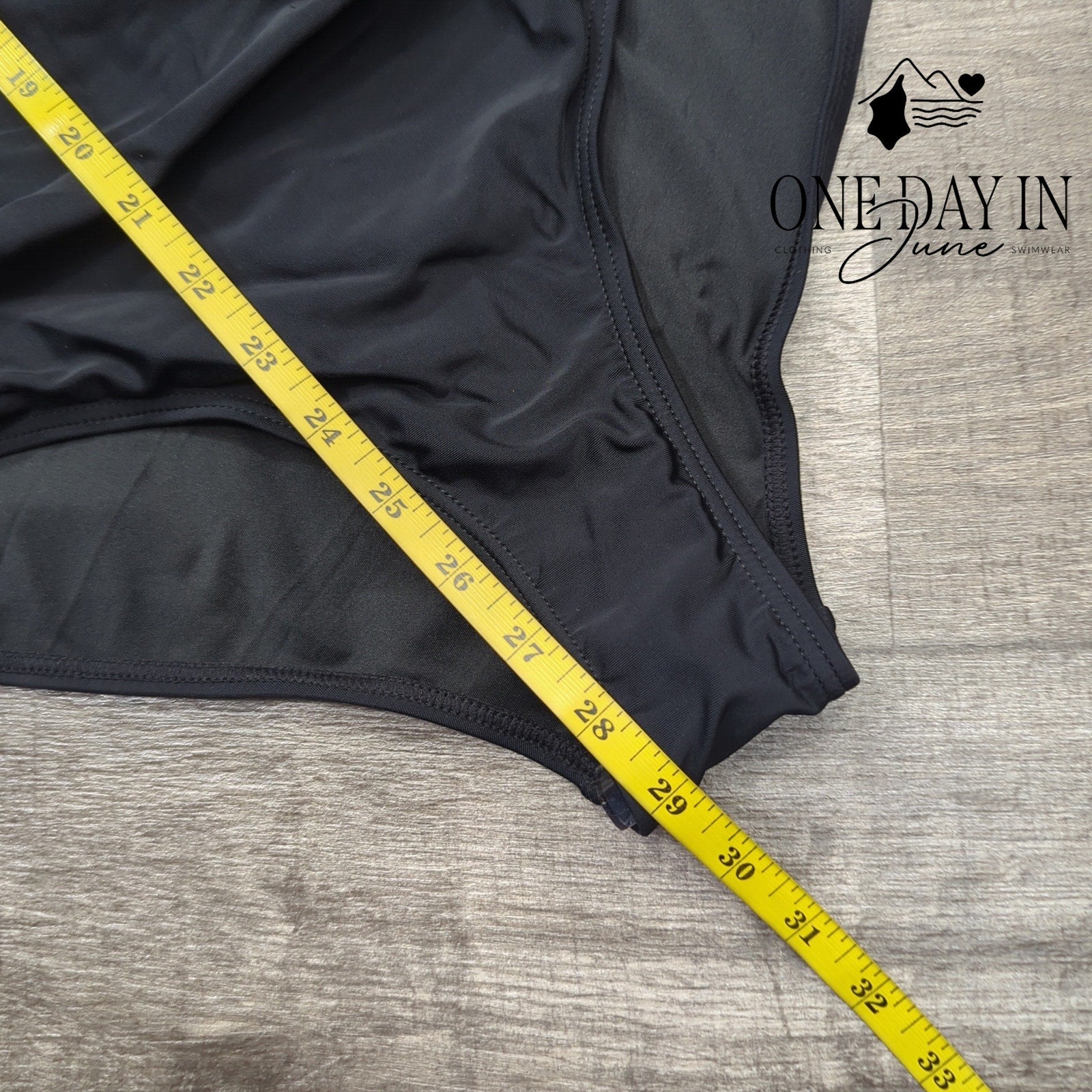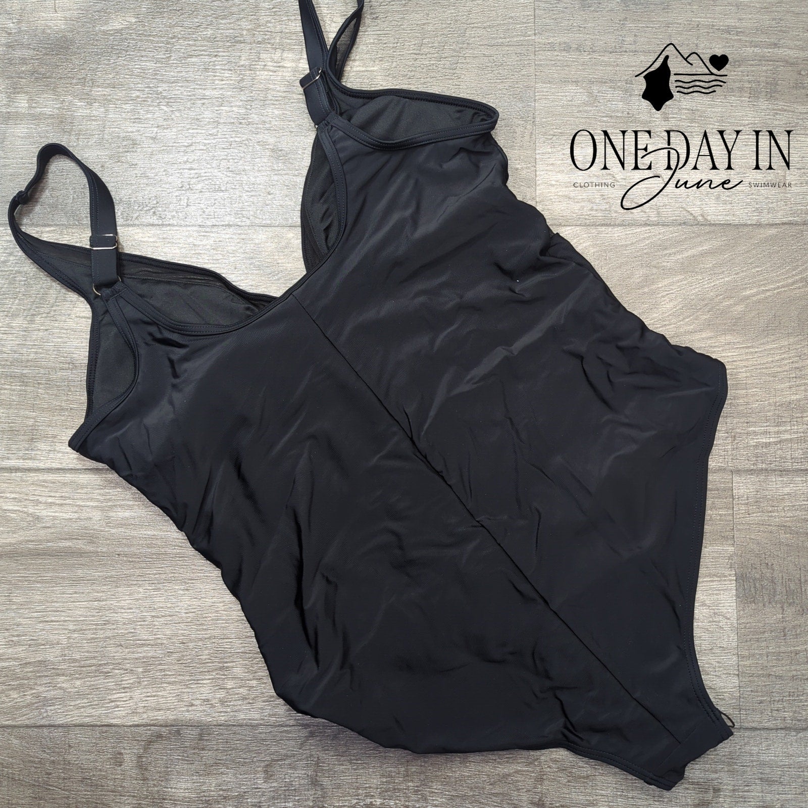 This splendid black swimsuit with mesh so fine, will make you look divine while you shine! With cutout details that are oh-so-neat, this one-piece wonder simply can't be beat!