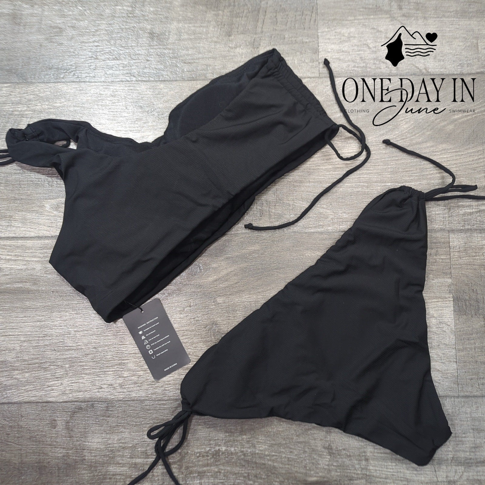 Oh my, what a suit for the beach or the pool, with one shoulder styling that's perfectly cool! Ribbed fabric with tie sides so sweet, this black beauty makes summer complete!